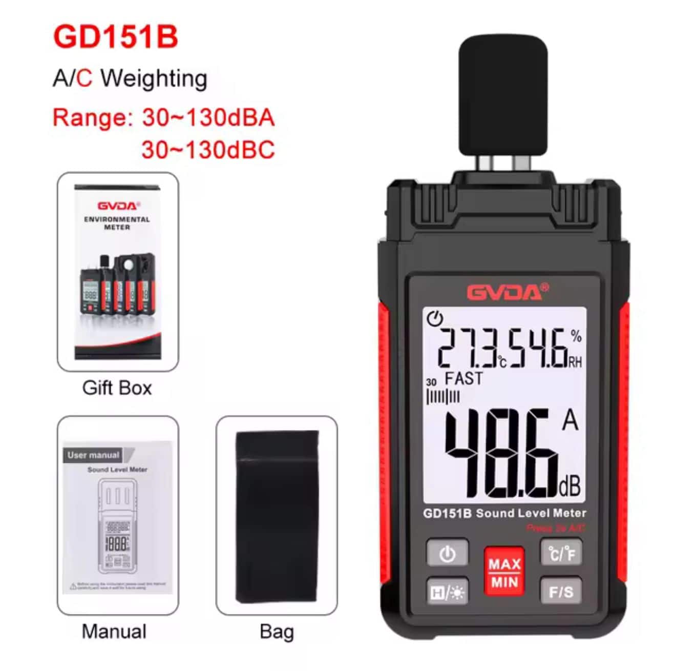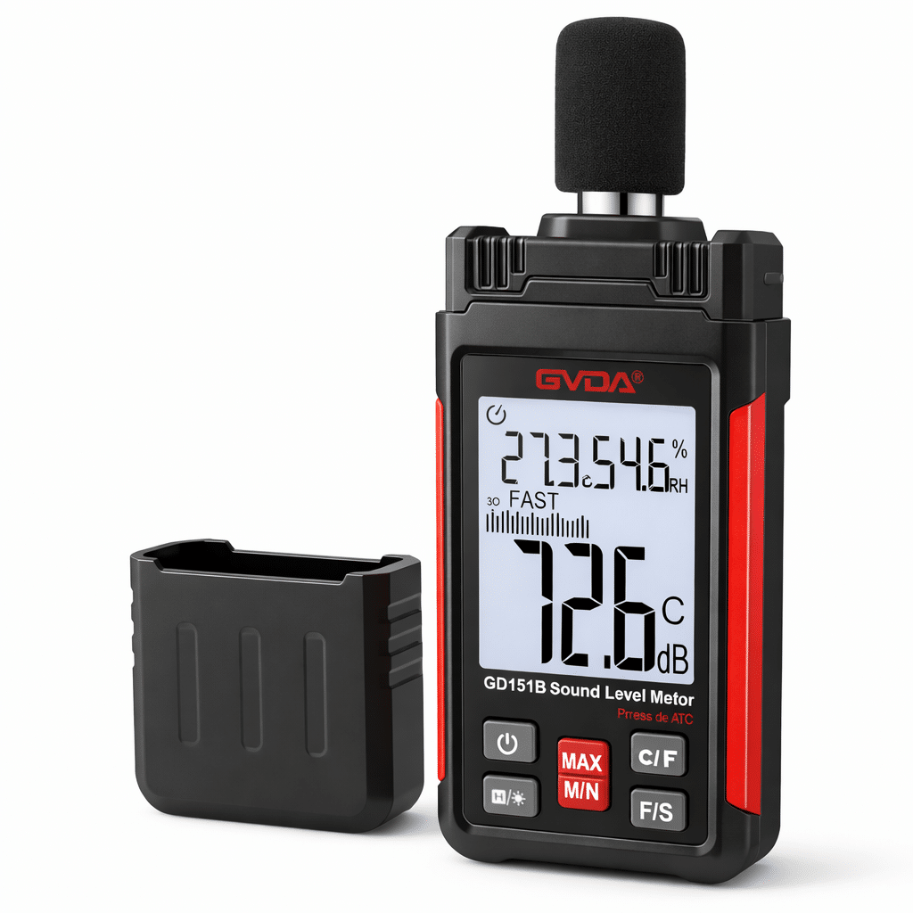 El medidor de sonido GVDA es una herramienta confiable y precisa para controlar niveles de ruido en entornos industriales, laborales o domésticos. Con un rango de medición de 30 a 130 dB, ponderaciones A y C, pantalla retroiluminada y funciones como retención de datos y medición máxima/mínima, este dispositivo permite evaluar condiciones acústicas con claridad. Además, mide temperatura y humedad, convirtiéndolo en una solución completa para análisis ambientales. Compacto, liviano y resistente, está diseñado para quienes requieren datos exactos y resultados inmediatos.