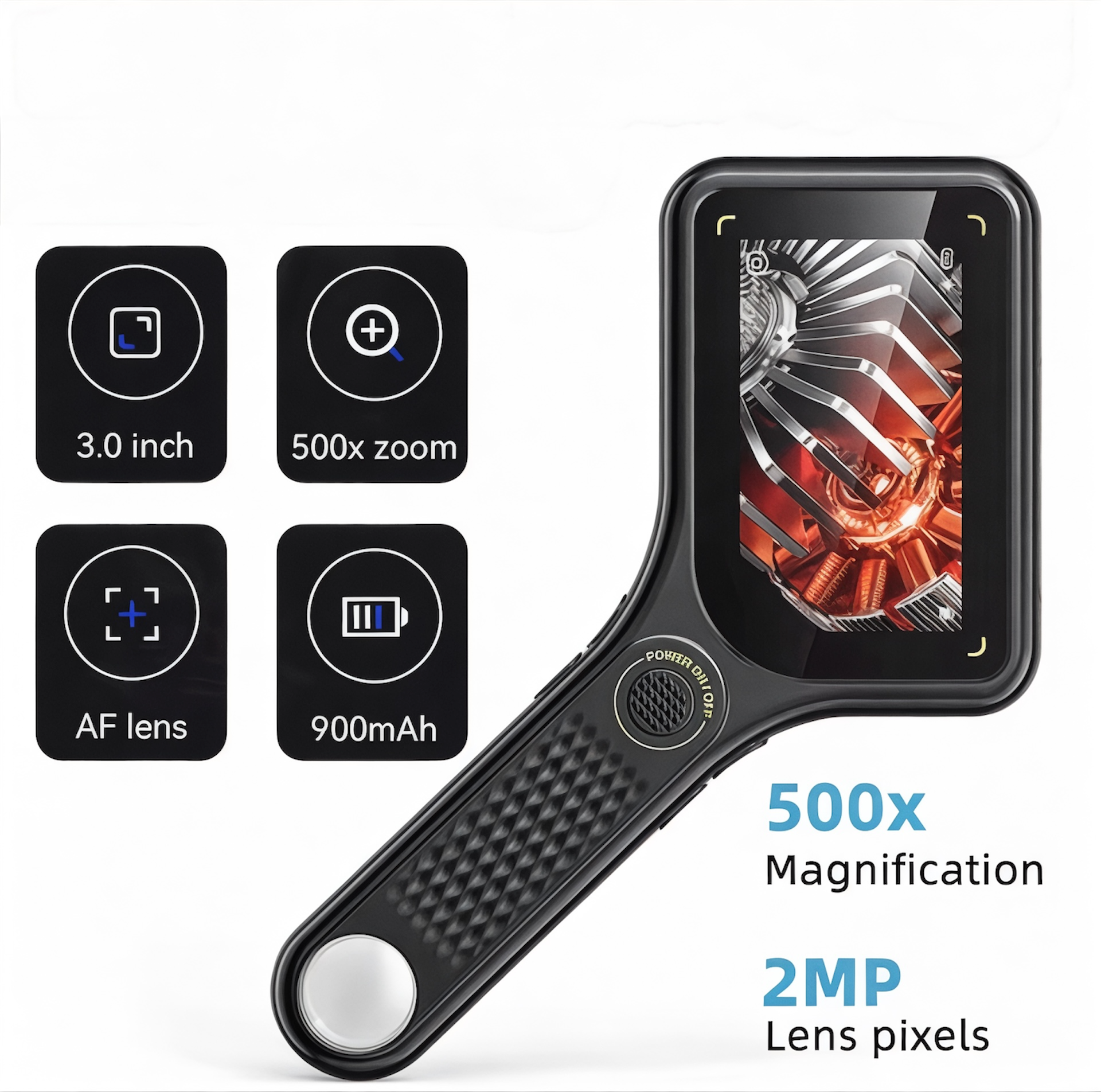 El microscopio digital portátil 500X permite observar detalles invisibles al ojo humano con claridad profesional. Su pantalla IPS integrada y sistema de enfoque automático facilitan inspecciones técnicas, electrónicas y educativas con resultados precisos y visualización cómoda.